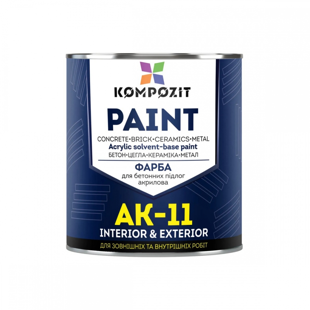 Kompozit АК-11 — акрилова фарба для бетонних підлог, що утворює міцне, зносостійке та водостійке покриття з сірим матовим відтінком. Розроблена спеціально для захисту й декоративного оздоблення бетонних та цементних поверхонь у житлових, промислових і складських приміщеннях, а також у гаражах, підвалах чи на відкритих майданчиках.