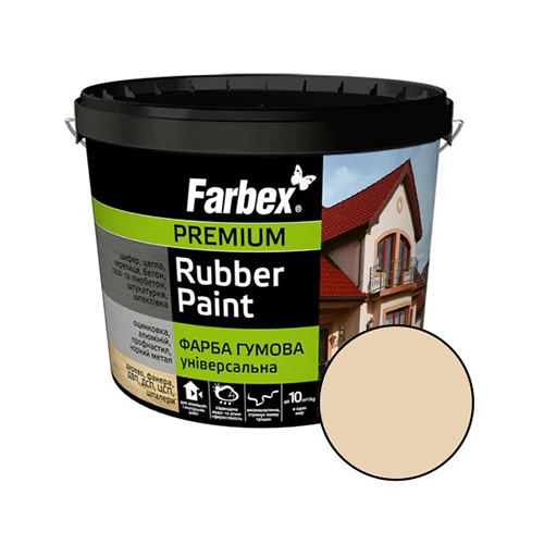 Гумова фарба Farbex — високоякісне універсальне покриття на акриловій основі, що утворює довговічну еластичну плівку бежевого кольору. Завдяки «гумовому ефекту» фарба не тріскається, не відшаровується, витримує перепади температур і надійно захищає поверхню від вологи, ультрафіолету та механічних пошкоджень.