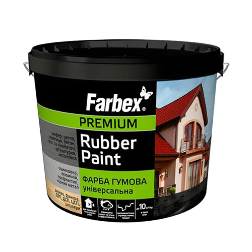 Гумова фарба Farbex — високоякісне універсальне покриття на акриловій основі, що утворює міцну та еластичну плівку чорного кольору. Завдяки своїй структурі фарба має «гумовий ефект», не тріскається, витримує перепади температур та захищає поверхню від вологи й ультрафіолету.