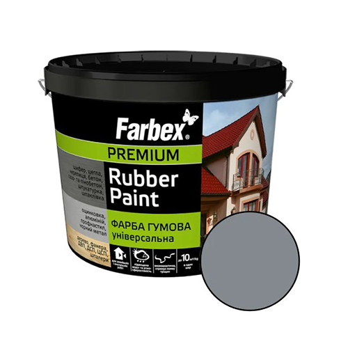 Гумова фарба Farbex — сучасне універсальне покриття на акриловій основі, що створює міцну та еластичну плівку сірої матової тональності. Завдяки «гумовому ефекту» фарба не тріскається, не відшаровується, витримує перепади температур і надійно захищає основу від вологи та сонячних променів.