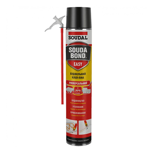 SOUDABOND EASY — це однокомпонентна поліуретанова піна-клей у ручному балоні, призначена для швидкого та надійного монтажу теплоізоляційних та облицювальних матеріалів. Підходить для приклеювання пінополістирольних плит (EPS, XPS), гіпсокартону, мінеральної вати, OSB, дерева та інших основ без необхідності застосування монтажного пістолета.