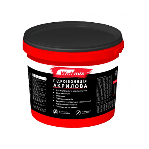 Wallmix Гідроізоляція акрилова — однокомпонентна пастоподібна гідроізоляційна суміш на базі акрилових полімерів. Створює еластичне, безшовне, водонепроникне покриття, яке ефективно захищає бетонні, цегляні, гіпсові та цементні поверхні від проникнення вологи та утворення грибка.
